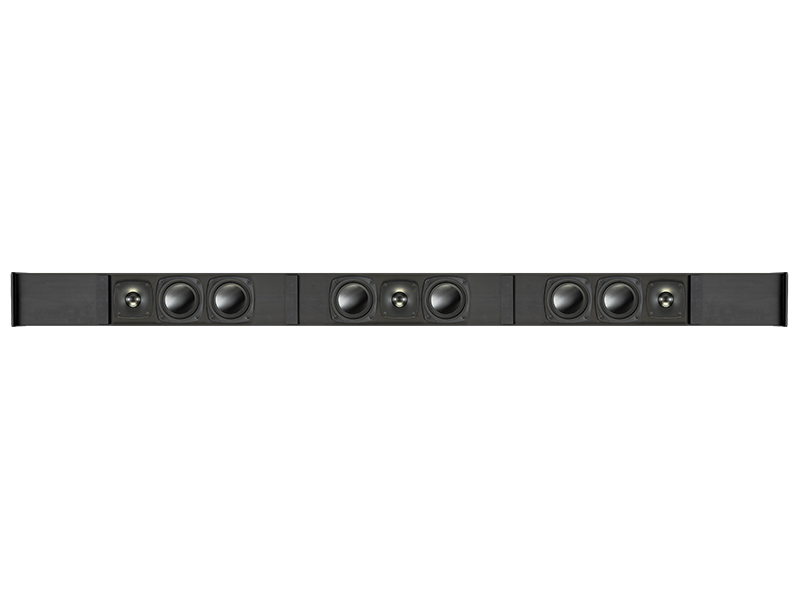Soundbar L/C/R Stereo + canale centrale personalizzabile in larghezza per TV da 65" a 85". 3 Tweeter da 25mm a cupola X-PAL(TM) da 25mm con lente acustica ad allineamento di fase PPA(TM) e 6 woofer/midrange da 114mm con cono in alluminio anodizzato. Sensibilità 94dB. Risposta in frequenza in asse 130Hz - 21KHz. Potenza amplificatore 15-130W. 8ohms. Chassis in alluminio estruso con griglia frontale in tela su supporto MDF e aggancio magnetico. Dimensioni (LxAxP): customx135x60mm. Supporto per fissaggio a muro in dotazione, vari accessori di montaggio opzionali.