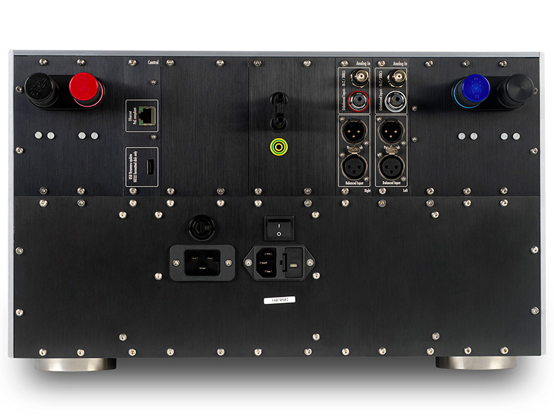 Finale di potenza stereo (tramite scheda opzionale Analog_BUF). Potenza 2 x 200W su 8 ohm in stereo o bi-amp e 1 x 700W su 8 ohm in mono a ponte. Pura classe A a discreti senza condensatori sul percorso del segnale per buffer di ingresso e configurazione in classe AB per la sola parte di potenza. Circuitazione simmetrica dual-mono. Trasformatore di alimentazione da 2200VA montato su un particolare silent-block, è collegato a un blocco di condensatori speciali red edition a 4 poli da 4X100.000 mF con sezioni separate per i circuiti di ingresso, driver e le sezioni finali. Possibilità di variare la controreazione da 0% a 100% con step del 20%, in modo da trovare il miglior interfacciamento con i diffusori. Collegamenti interni e terminali di uscita in argento. Ingresso selezionabile tra RCA, XLR e BNC. Display a colori RGB Amoled con risoluzione 480x272 pixels. Ingresso USB per aggiornamenti software. Controllo remoto tramite presa Ethernet.