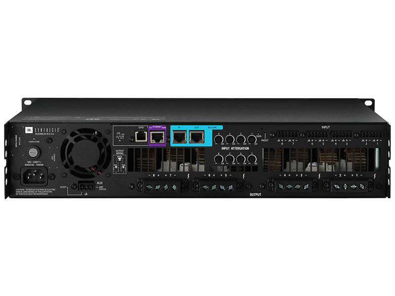 Amplificatore audio a 8 canali. Classe D. Potenza 300W RMS per canale su 8ohm, 600W RMS per canale su 8ohm in configurazione a ponte (4 canali). Stabile fino a 2 Ohm. DSP. Ingressi: 8 analogici bilanciati su connettori a blocchi, digitali su BLU Link RJ45, Morsetti per diffusori su terminali a blocchi. Linea 70/100V. Porta Ethernet. Controllo tramite TCP/IP o iOS App software. Dimensioni (LxAxP): 483x89x36 mm. Peso: 10,6 kg. Montaggio a rack 2U.