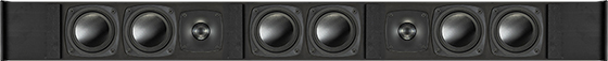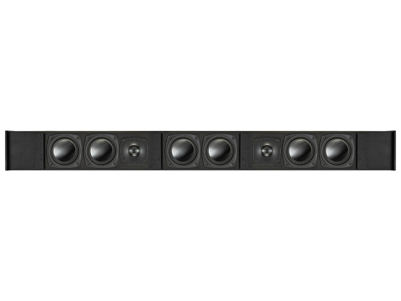 Diffusori L/C/R Stereo + canale centrale personalizzabile in larghezza per TV da 85" a 100". 4 Tweeter da 25mm a cupola X-PAL(TM) da 25mm con lente acustica ad allineamento di fase PPA(TM) e 12 woofer/midrange da 114mm con cono in alluminio anodizzato. Sensibilità 92dB. Risposta in frequenza in asse 130Hz - 21KHz. Potenza amplificatore 15-130W. 8ohms. Chassis in alluminio estruso con griglia frontale in tela su supporto MDF e aggancio magnetico. Dimensioni (LxAxP): customx135x60mm. Supporto per fissaggio a muro in dotazione, vari accessori di montaggio opzionali.