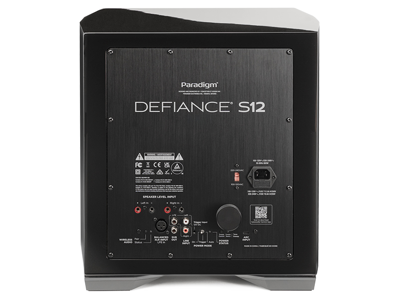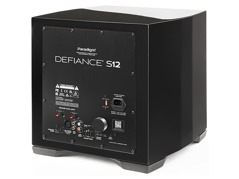 Subwoofer attivo wireless in sospensione pneumatica con emissione frontale. Woofer S-PAL™ a lunga escursione da 30cm con cono in alluminio e cestello in pressofusione d'acciaio. Potenza di amplificazione 800W continui e 1600W di picco, in classe D. DSP ad alta risoluzione con processamento a 64-bit. Ricevitore wireless interno e trasmettitore wireless in dotazione. Risposta in freq. minima 16Hz. Paradigm Subwoofer Control app per iOS e Android tramite Bluetooth. Possibilità di calibrazione tramite PBK ARC® Calibration Kit (opzionale). Regolazione del volume e del taglio di frequenza. Fase 0/180°. Test Tone. Ingressi linea RCA e LFE (anche XLR) e ingressi ad alto livello. Uscita Sub RCA. Trigger 12V. Cabinet in MDF da 2,54cm di spessore, con rinforzi interni. Piedini anti vibrazioni dotati anche di punte coniche. Dimensioni (LxAxP): 40,2x41,8x41,4cm. Peso: 24,3Kg.
