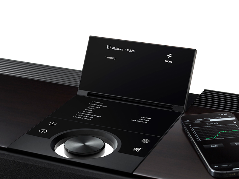 Tutto può essere controllato tramite il display touchscreen motorizzato che si solleva e inclina automaticamente, il telecomando dedicato e l’app Prisma proprietaria Primare.