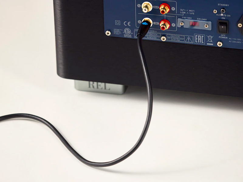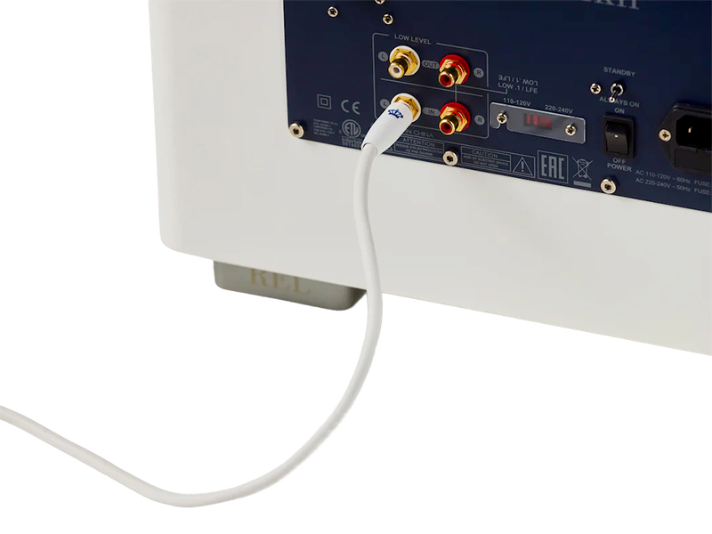 Cavo per subwoofer .1/LFE. Architettura del cavo e dei connettori RCA sviluppata da REL, basso rumore. Ideale per subwoofer REL delle